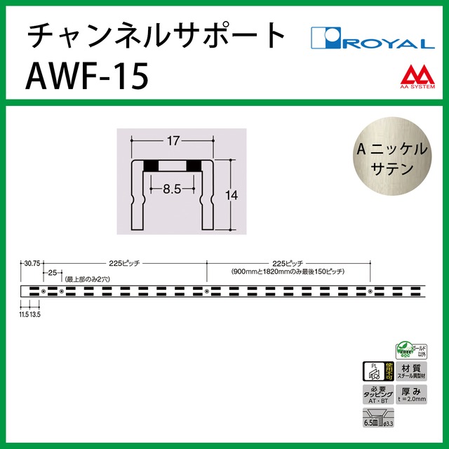 ■商品名 AWF-15 チャネルサポート ■サイズ 1500㎜ ■カラー Aニッケルサテン ■材質 スチール異型材 ■厚み 2.0㎜ ■必要タッピングビス AT-P・BT-P