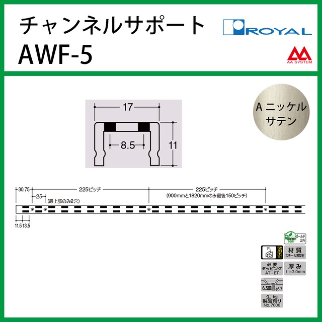■商品名 AWF-5 チャネルサポート ■サイズ 1820㎜ ■カラー Aニッケルサテン ■材質 スチール異型材 ■厚み 2.0㎜ ■必要タッピングビス AT-P・BT-P